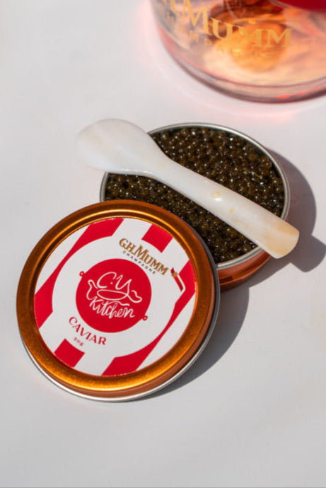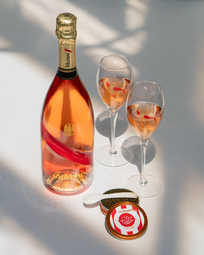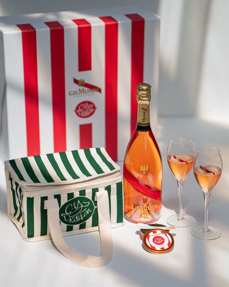 This exclusive press package brought together the elegance of GH Mumm Champagne and CYK's signature caviar in a perfectly curated pairing. Each set featured a co-branded 50g Golden Ossetra tin, hand-selected glassware, and a bottle of GH Mumm, all presented in a luxe red and white striped gift box - an ode to craftsmanship and timeless luxury.