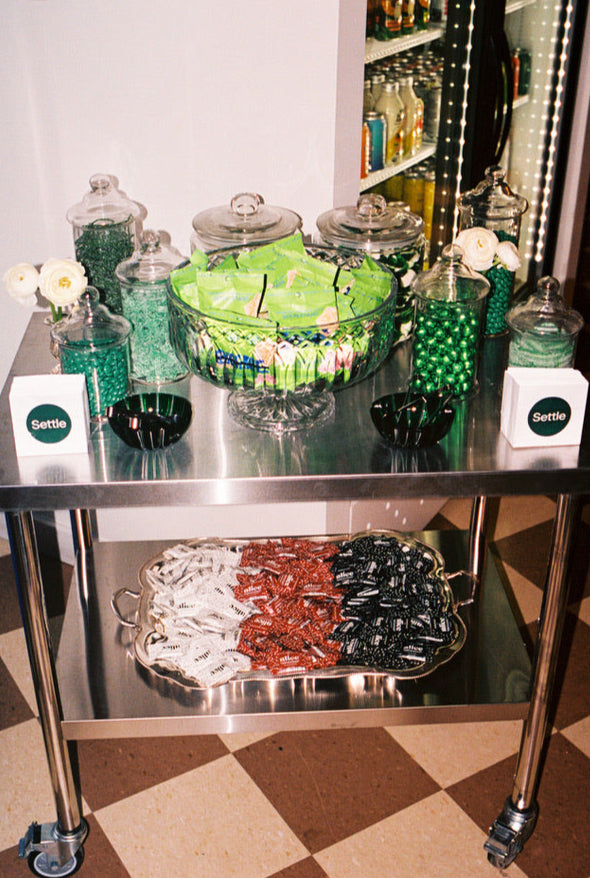 A playful night celebrating consumer product founders with Settle at the iconic Pop Up Grocer in New York City. Guests were greeted by an all green candy cart, mini hot dogs were served with CYK Caviar, a to-go counter was transformed into a pizza and caviar bar, while live jazz played in the background.