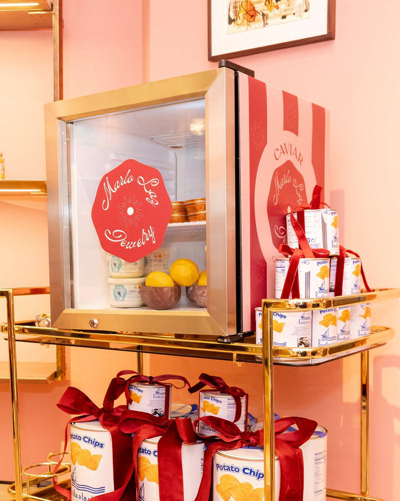For the holiday season, CYK designed a bespoke caviar fridge at Marlo Laz's Upper East Side boutique. Featuring Marlo Laz-branded Golden Ossetra tins, elegantly paired with French crème fraîche and artisanal olive oil potato chips from Spain, the display seamlessly blended luxury, craftsmanship, and culinary excellence.