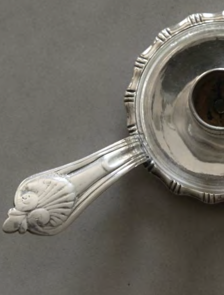 Silver-plated single candle chamberstick with fluted handle and scalloped rim. Designed for taper candles, compact and full of old-world charm.