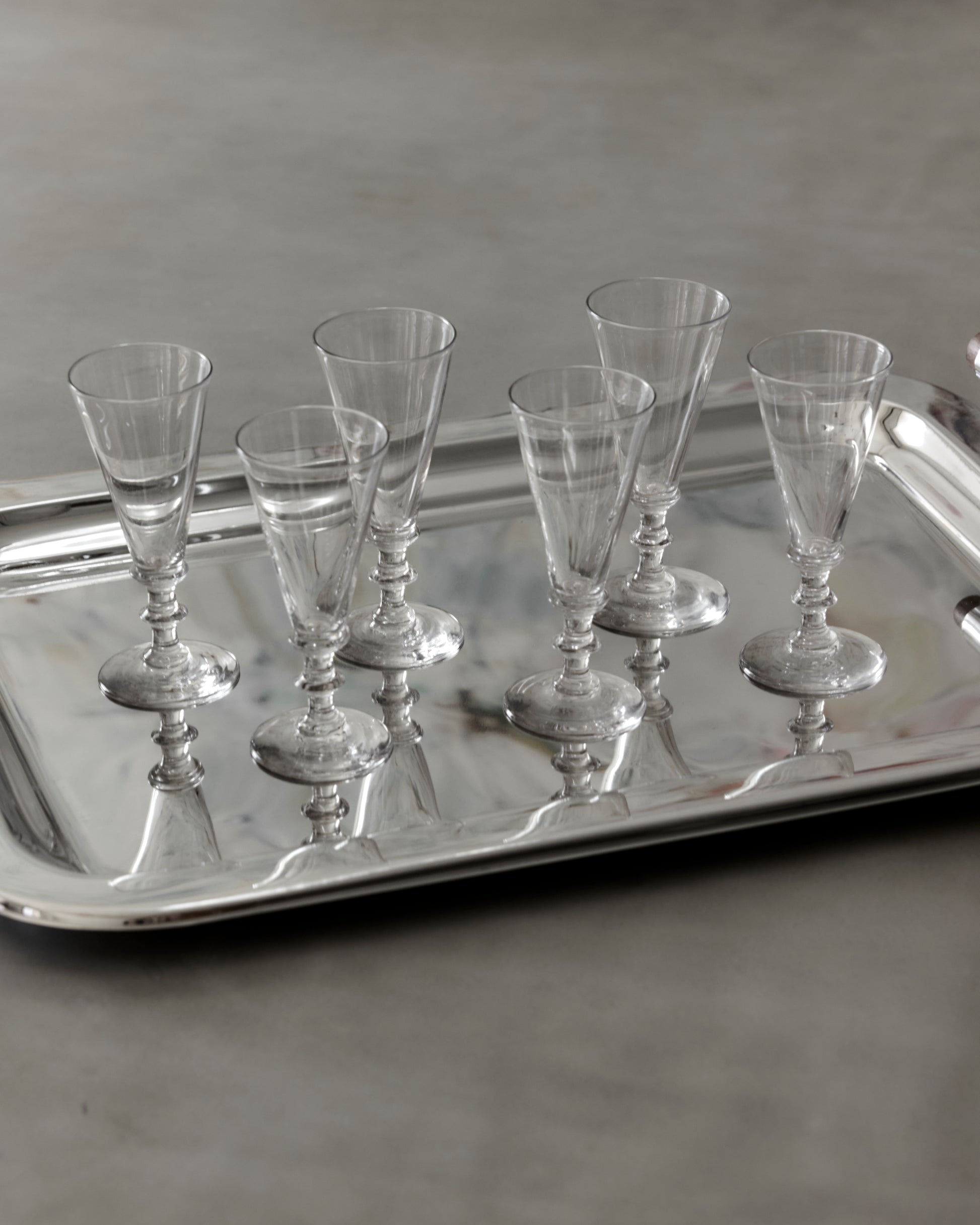 Set of six vintage-inspired champagne glasses with flared rims and baluster stems. Each glass is handblown with subtle variations and a clear finish, ideal for serving sparkling wine or festive aperitifs. Unmarked but reminiscent of early 20th-century European glassware.