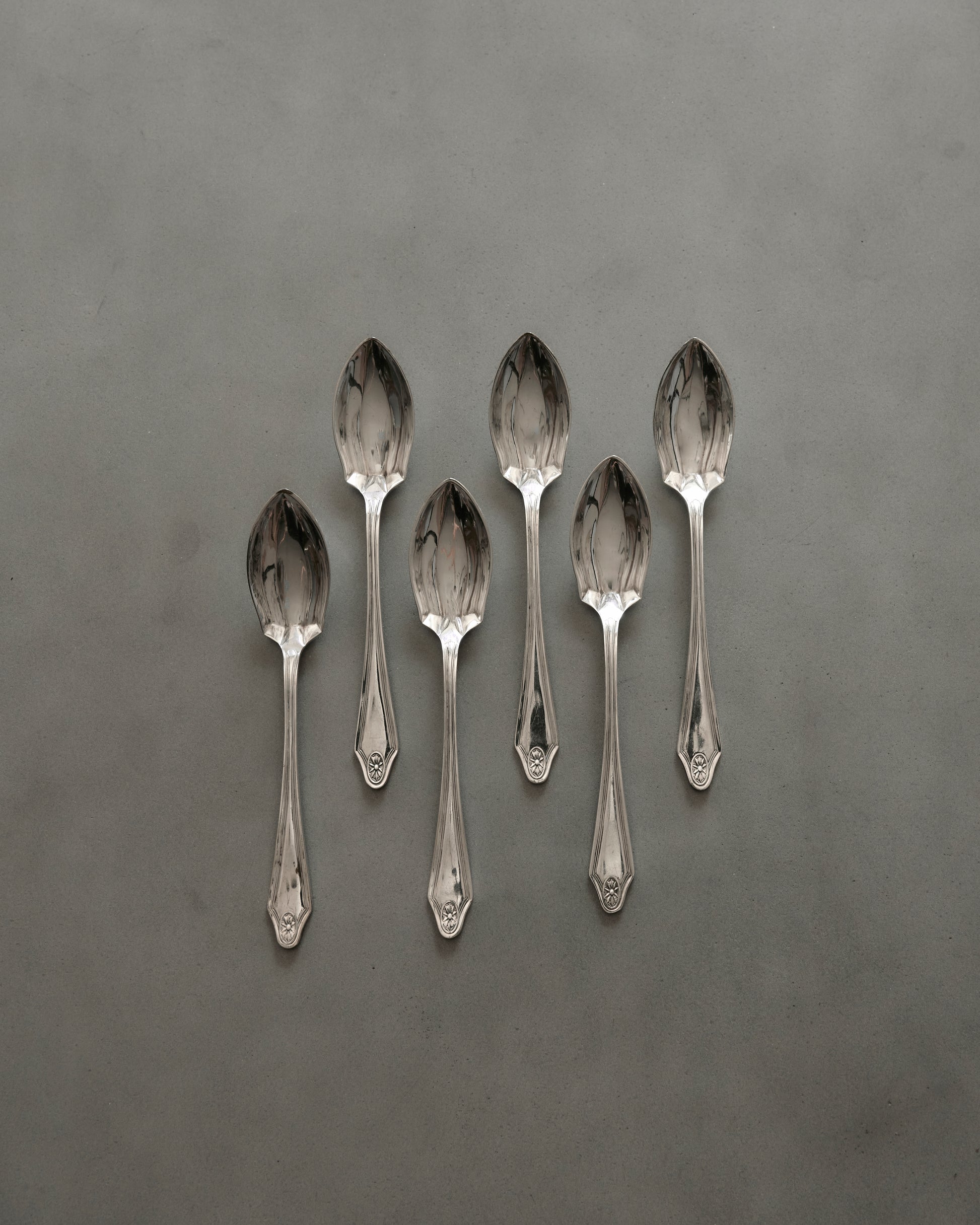 Set of six silver-plated dessert spoons with petal-shaped bowls and tapering handles. Neoclassical medallion motif perfect for elevating dessert service