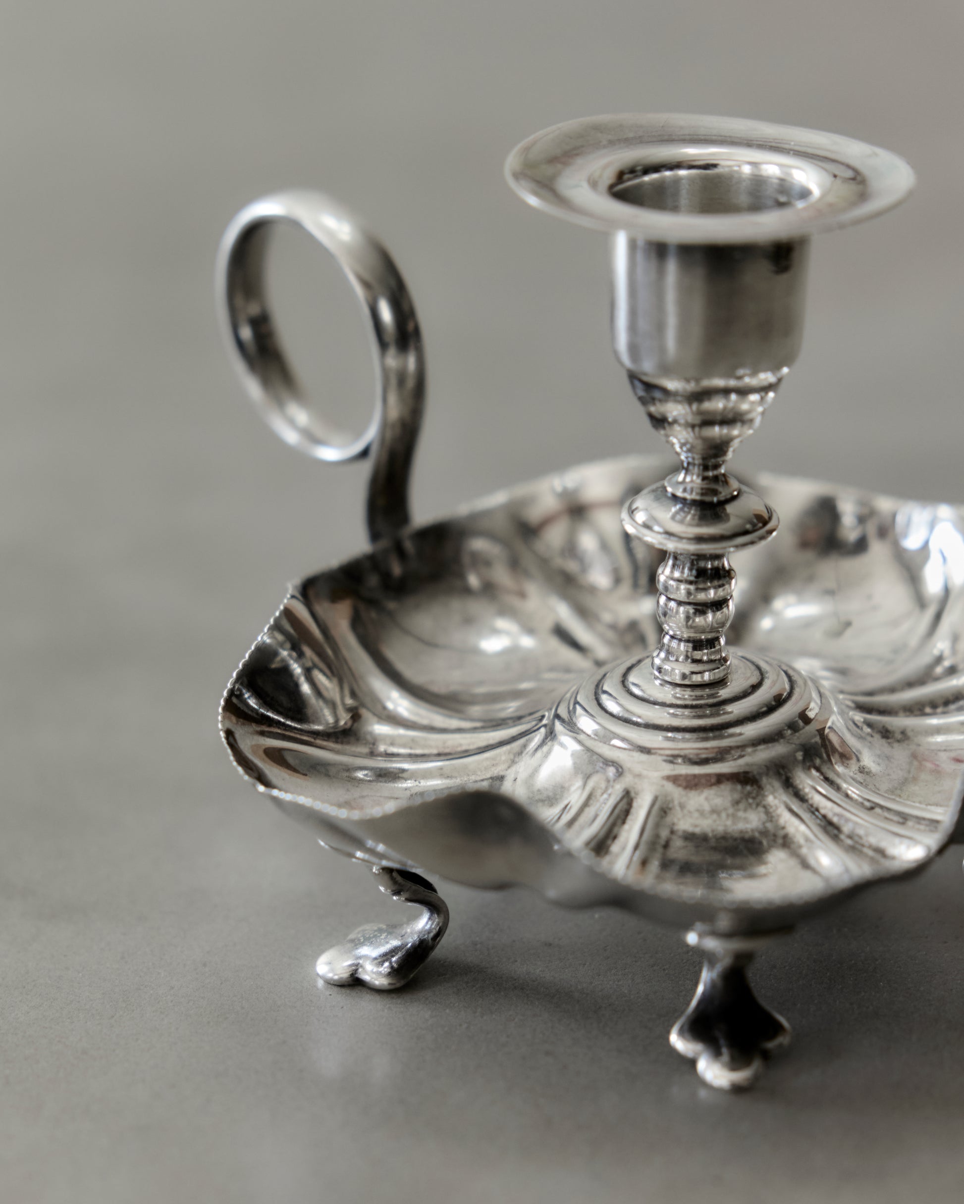 Silver-plated chamberstick with a rare floral base and loop handle. Sculptural yet compact, adds quiet charm to shelves and tables.