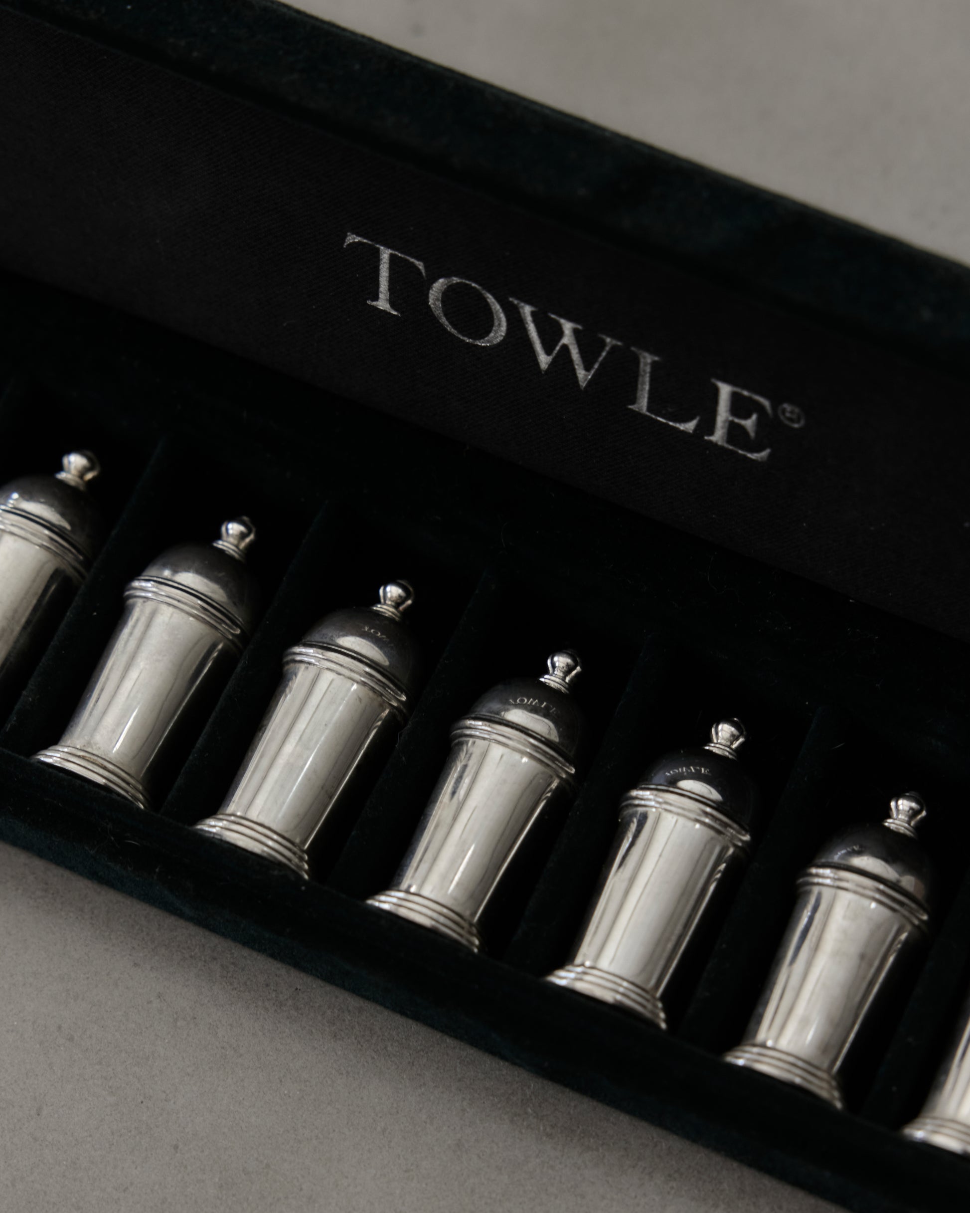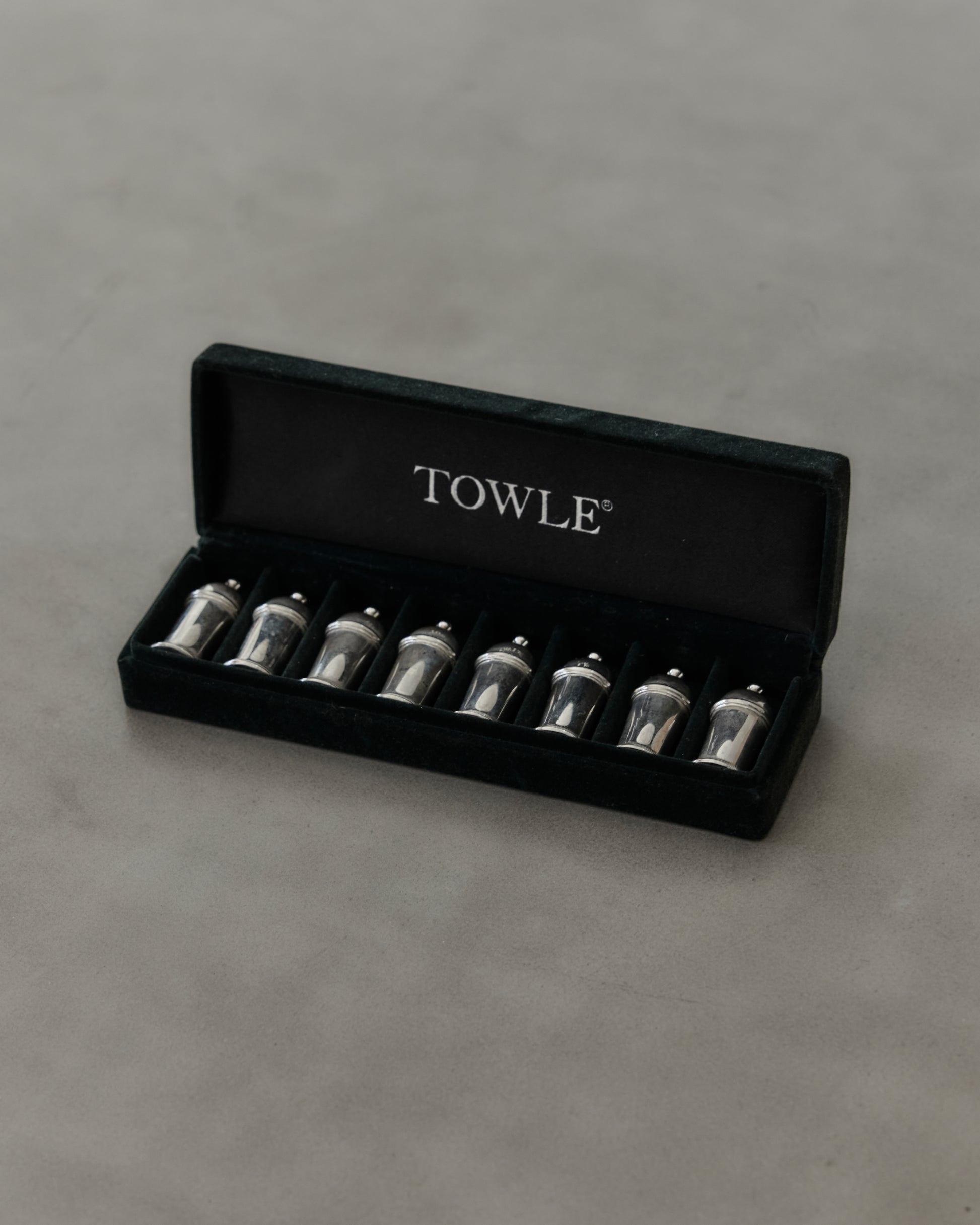 Towle boxed set of eight miniature salt and pepper shakers in sleek cylindrical form with domed tops. Mid-century American silverware in original velvet-lined case.