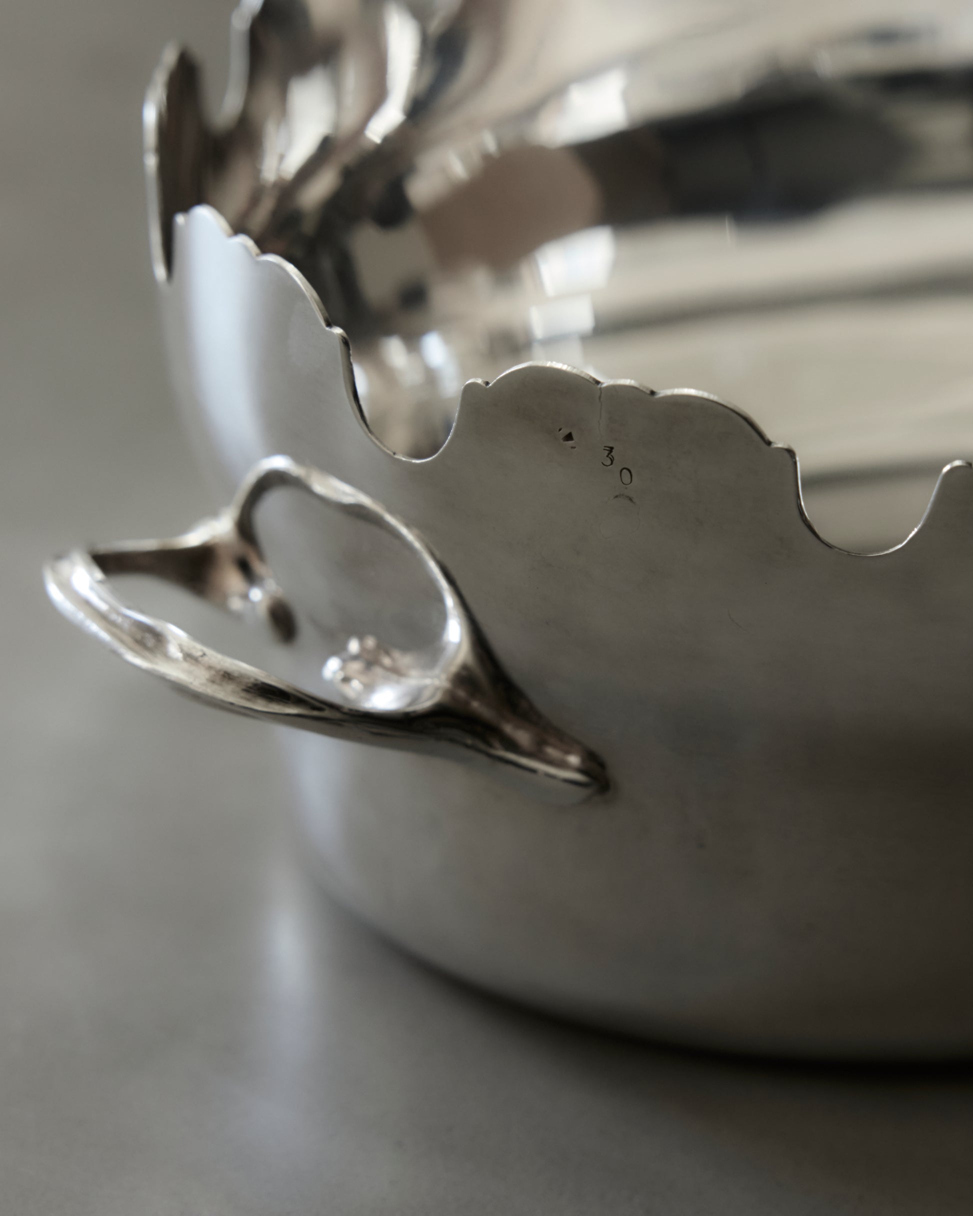 Pair of triple silver-plated buckets originally used for cooling champagne glasses in France, circa 1890s. Each bucket features a silver-plated stamp (3, 0) located near the handle on the top scallop. Vintage condition with minimal wear.