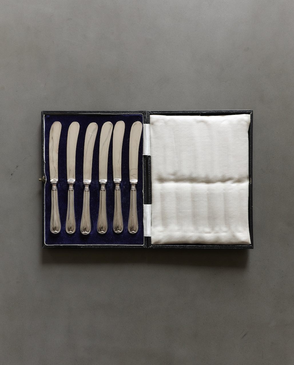 Set of vintage butter knives in stunning condition. Featuring sterling silver handles and stainless steel blades, housed in a fitted presentation case. Classic design with smooth, polished surfaces, offering refined table service and elegant storage.