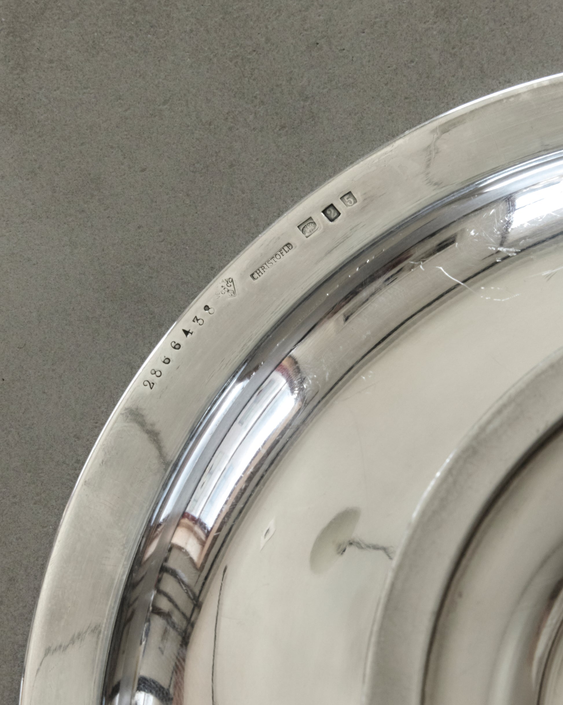 Set of two silver-plated footed trays by Christofle, showcasing a refined linear border with signature crisscross detailing. Mid-century French design with low feet and a soft, even patina.